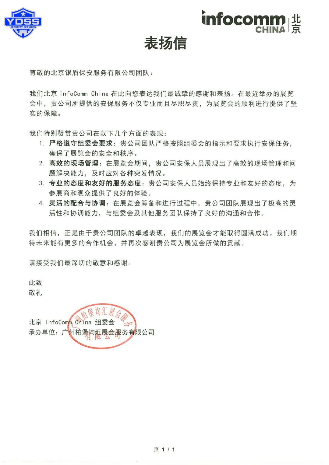 每一面錦旗和每一封感謝信背后,都蘊(yùn)藏著保安團(tuán)隊(duì)辛勤付出的故事。無(wú)論是日夜輪班的堅(jiān)守,還是面對(duì)復(fù)雜情況時(shí)的冷靜處理,他們都展現(xiàn)了超越平凡的不凡品質(zhì)。正是由于保安團(tuán)隊(duì)的不懈努力,才使得成千上萬(wàn)的參觀者能夠安心享受這場(chǎng)視聽(tīng)盛宴。他們的默默奉獻(xiàn),為此次InfoComm China展會(huì)的成功舉辦增添了濃墨重彩的一筆。