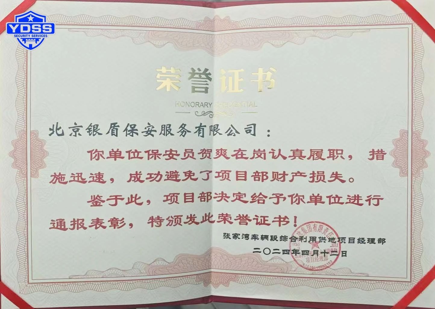 2024年5月24日夜里10點(diǎn)多,北京銀盾保安服務(wù)有限公司駐北京城建集團(tuán)張家灣車輛段綜合利用供地項(xiàng)目經(jīng)理部保安隊,接到張家灣項(xiàng)目經(jīng)理部電話,說現(xiàn)場發(fā)現(xiàn)偷盜現(xiàn)場物資的可疑人員,接到通知后保安隊迅速組織人員前往現(xiàn)場查看。到達(dá)現(xiàn)場后,經(jīng)了解查看出門條,當(dāng)值保安員賀爽因?qū)Ψ讲荒芴峁┏鲩T條,沒讓出去,此時車上下來一些人把保安叫到一邊私自談話,賀爽同志遵守原則,按照規(guī)章制度辦事,未給予放行,并報張家灣項(xiàng)目經(jīng)理部領(lǐng)導(dǎo)處理,避免了張家灣項(xiàng)目經(jīng)理部財產(chǎn)損失。